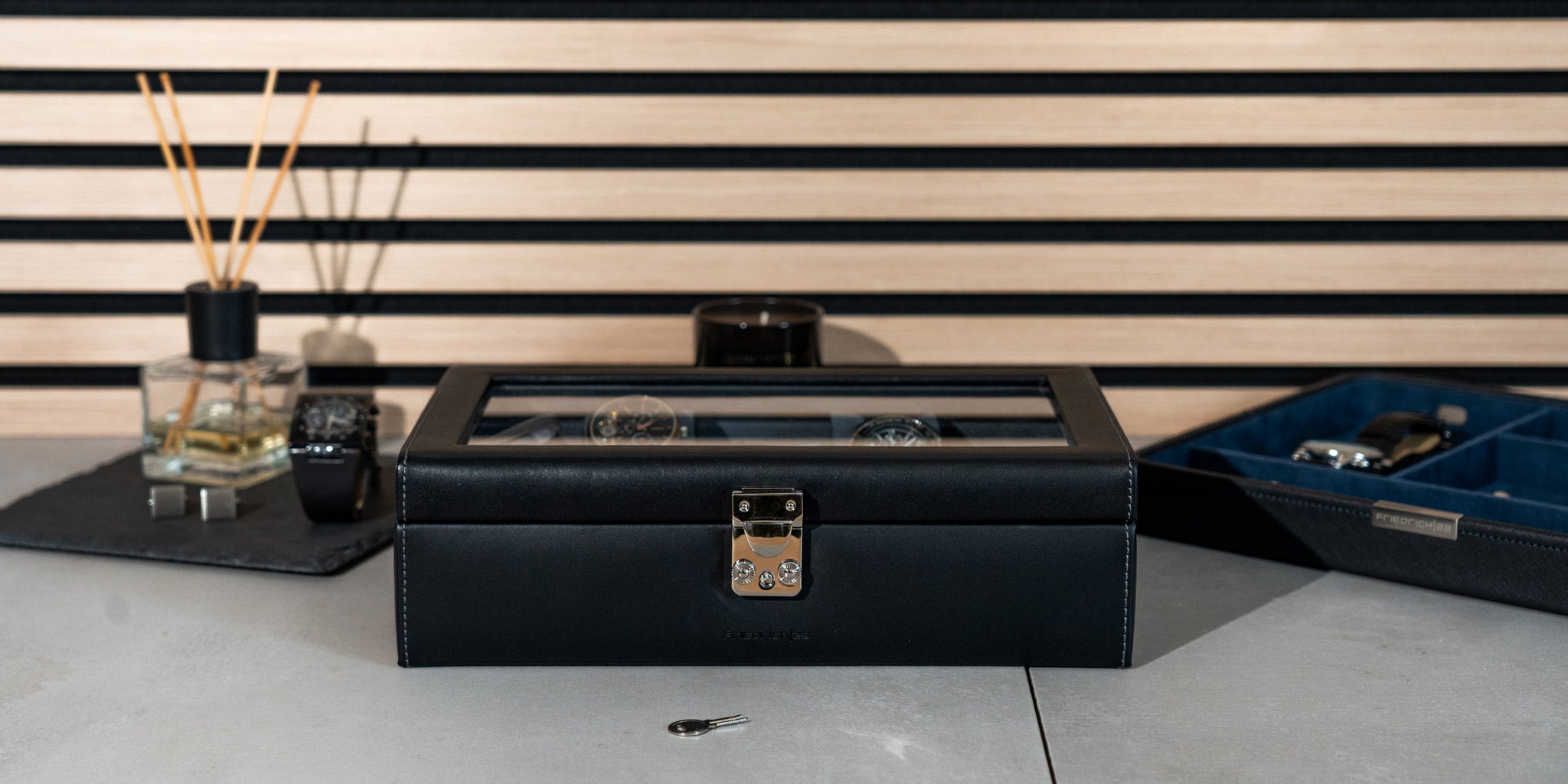 Diese exklusiven Uhrenaufbewahrungsboxen sind nicht nur äußerst funktional, sondern auch ein echter Blickfang in jedem Raum. Sie bieten Platz für bis zu 20 Uhren und verfügen über praktische Fächer, in denen weiteres Zubehör sicher verstaut werden kann.