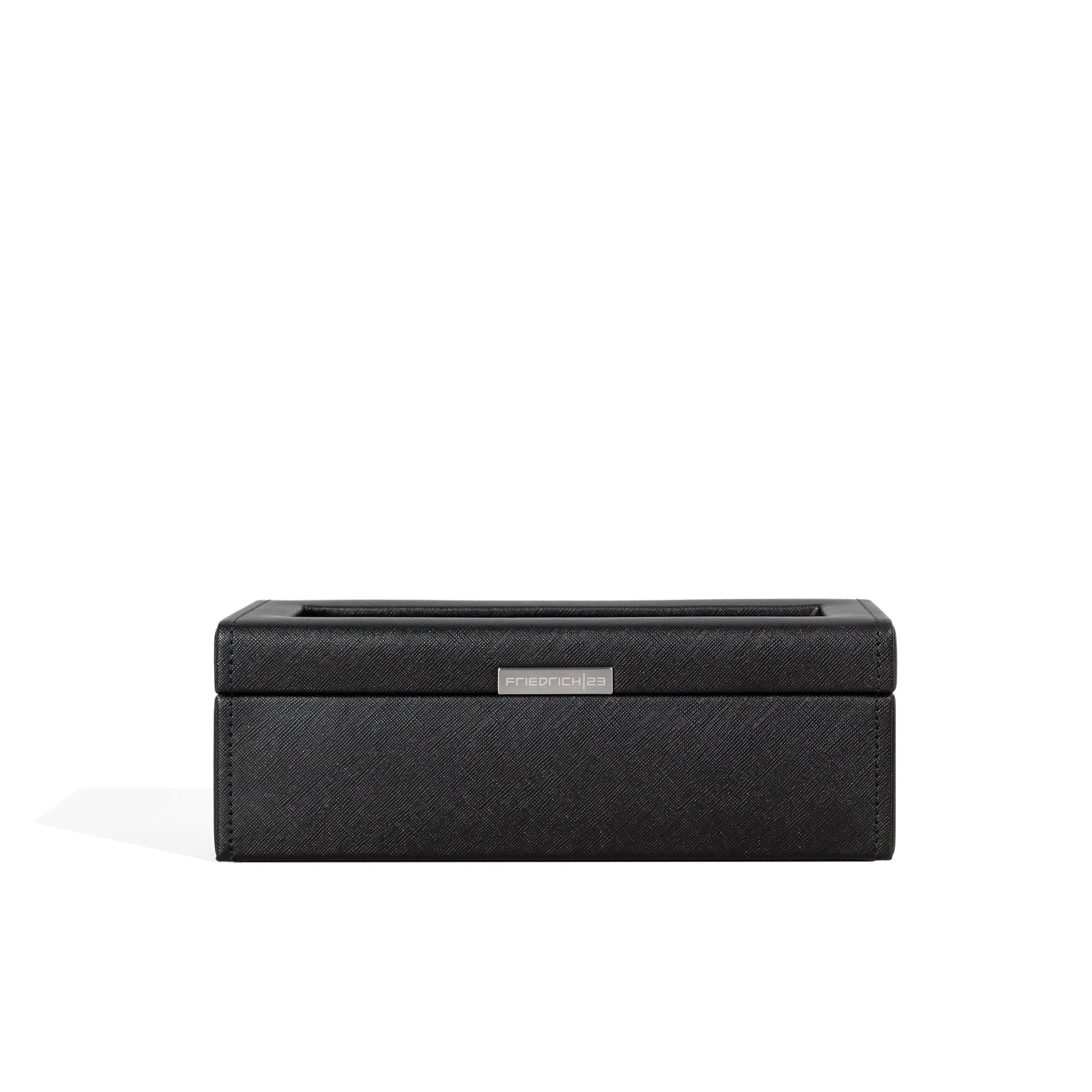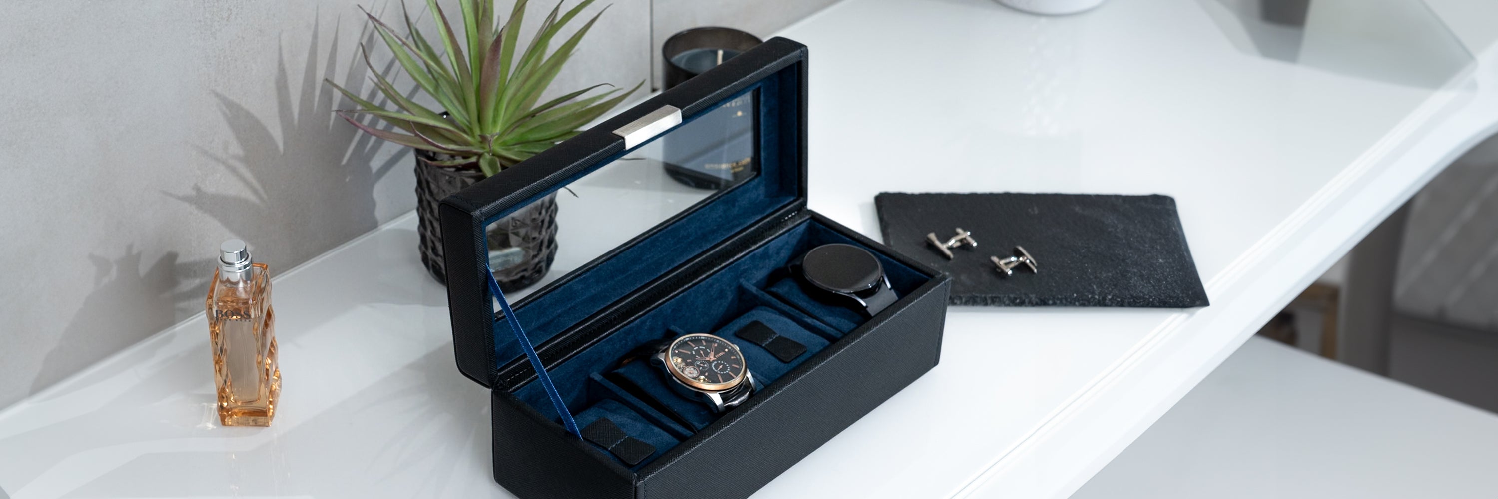 Neben Platz für acht Uhren bietet der herausnehmbare Einsatz zwei zusätzliche Fächer für Ringe, Manschettenknöpfe oder Accessoires – perfekt, um Deine Lieblingsstücke sicher und geordnet zu verwahren.