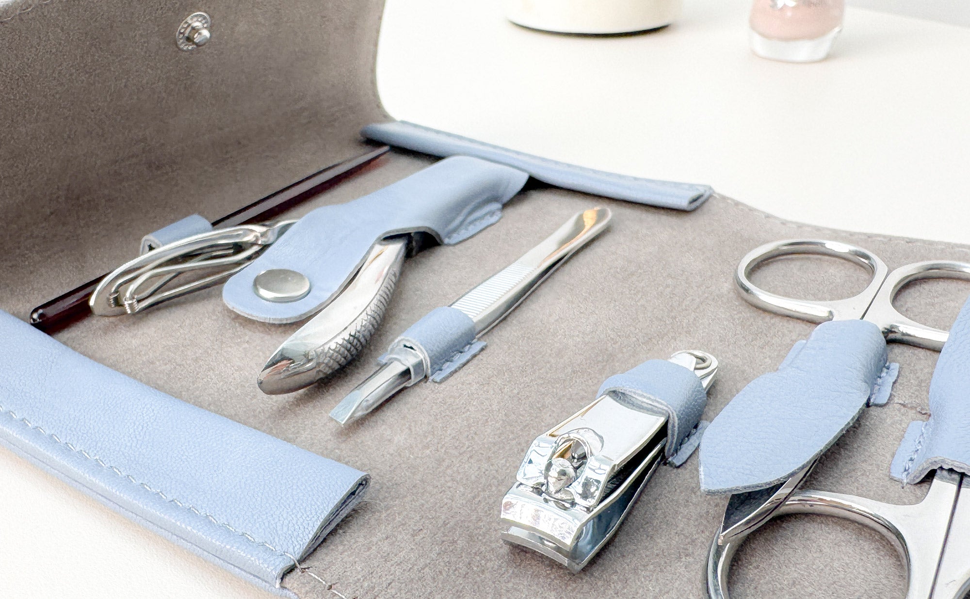 Mit diesem Maniküreetui aus Leder hast du dein komplettes Maniküre Set für Reisen immer dabei – kompakt und stilvoll.